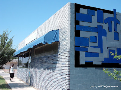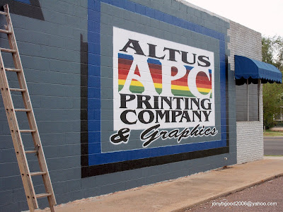 I went out again today, and -- I don't know about the people in this town we are in right now...so work is very sluggish, not coming in like I am used to. I look forward to going out of here...let me see if I can find some more pictures to tell you about...This is Altus Printing here in town. They wanted us to do just 'some' upgrades, like finish a large wall sign that they had...but we offered them the whole building to be re-done...all the way down to repainting the bricks and then re-installing (painting) the mortar back in between them... I get a big rush changing the color of brick as you may see in some of these pictures. In this picture, we are almost finished completing the large wall sign for them. This project really made a big difference when you viewed the building from the street.... You can see the changed -remastered- brick on the bottom towards the front, and then up above you can see the brick that has yet to be done...this is a good shot of 'before and after'......On the other side of this medium sized one story building, there was an old faded and ragged out sign that, instead of restoring what was there, we had a large supply of high quality paneling that had been thrown away. We used the colors of our theme to build an abstract work of geometric patterns. You can see this picture up above about four pictures back.