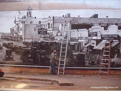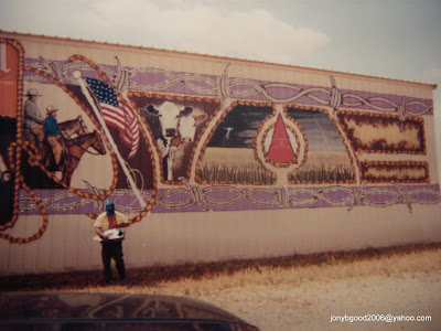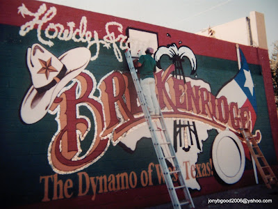 Here are some more of these past photos of murals and artwork we have done. When I upload these, there will be no more, because I could sit here and do this all day long and I have other things to do everyday. But thanks for visiting my blog and everything...I can usually be reached by Skype phone at 580-301-7099 and if you email me the address is... jonybgood2006@yahoo.com ....thanks- Later I will get more current pictures. This one mural here on the left is of Angel gluing mirrors to this spanning mural in Seymour Texas...this took forever but it was all worth it...This is the painting that got us discovered by MAINSTREET BRECKENRIDGE in TEXAS. After working in Breckenridge for about four or five months, we were entered into a state-wide contest where we placed first against 138 cities and towns for BEST PUBLIC IMPROVEMENT. What a blast...imagine that- two guys that cared enough about their lives to become something great.