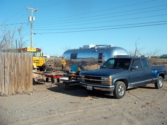 Well, we have left our winter camp and have moved across town to our first work place (combination camp) The idea or plan I have is to be able to live right where we are painting...Thus no wheels are really needed to do things. This forst job site is kind of a testing ground where I will be making notes about everything we have- everything we do- and everything we need to make this happen. This is how we are parked for starters, with the house front door facing into the north. A large ditch behind us where the cats can explore...and if you look into the reflection of the end of the Airstream, there is a rflaction of a school bus that is stored right behind us. This is where the cats stay at night in their pens. Trader Tom's Tavern is the name of this business. Tom Peters , a long long time restaurant owner and club manager is the man who got with me on the idea we could live in the back and trade out painting for rent. This mural of his was painted 16 years ago by me (feels like longer) that you see to the right. I have started to paint just south of the black pickup where those planters are sitting. The idea is to get used to this area and kind of decide what to paint and where along with how. So far so good. Here is Angel just after we arrived here. He seems to like it (so far)
