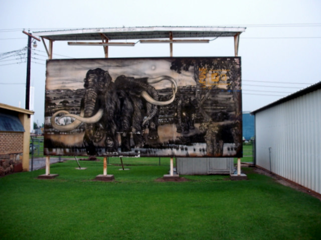 We have moved for the remainder of the summer-to get away from the direct heat-to a pad in between two homes. This is much more better for everyone. A commission came up from a small town (Eldorado, Okla.) where I had painted a 'momma bear sized' mural portraying a whooly mammoth elephant family (all in black and white. we did this about nine years ago, and thats a great record for staying intact. The mural is in position at the towns' museum about thirty miles away. I have to make a journey -guessing the best times to paint while it's so hot outside, and have already made two or three nights on the project so far. nd am madly trying to get this thing finished- so another job will form. Hopfully from the city itself- to have their welcome signs fixed also in time for their alumni. all I have right now are pics from when the mural here was first made in Amarillo - nine years ago.