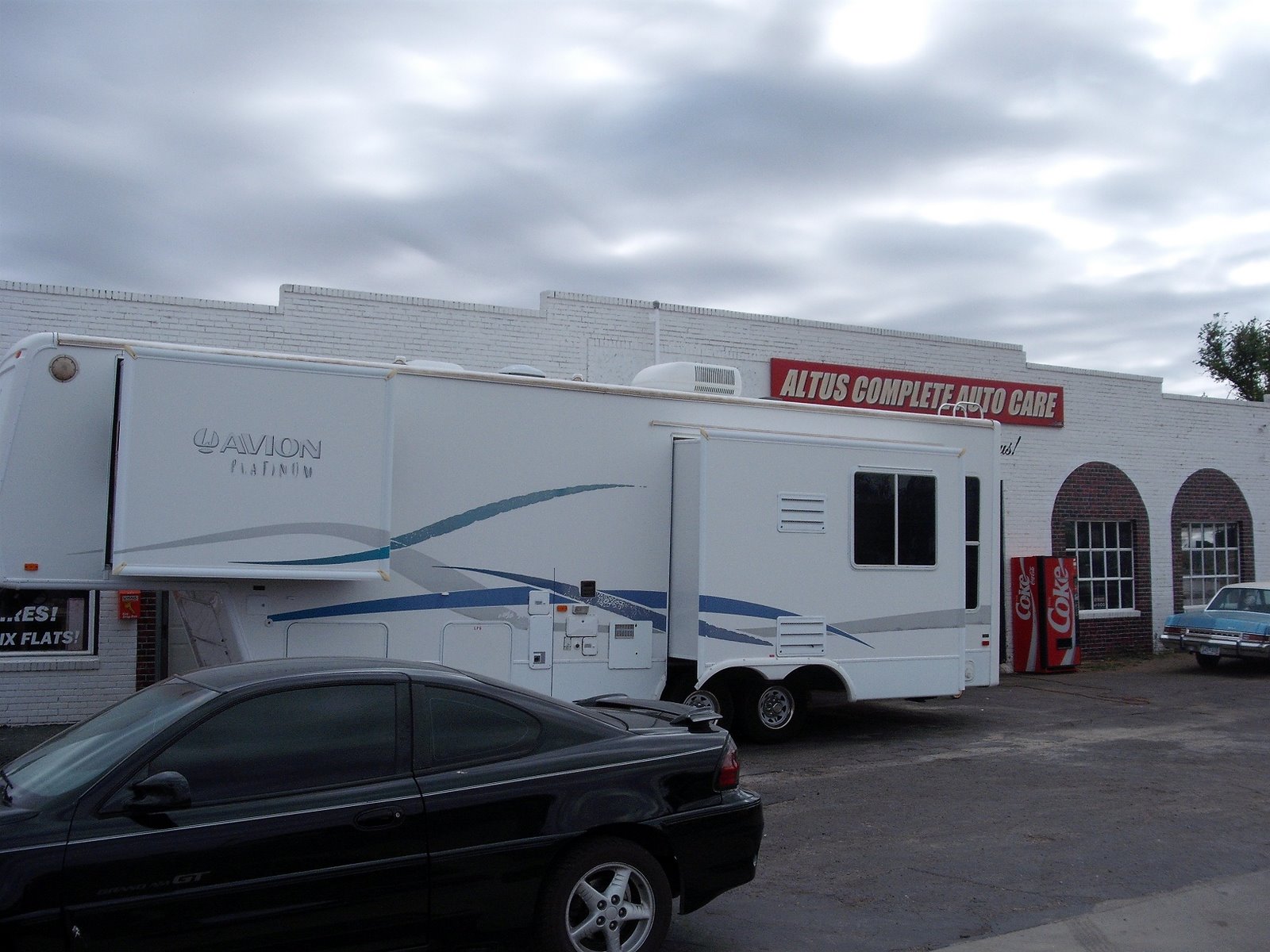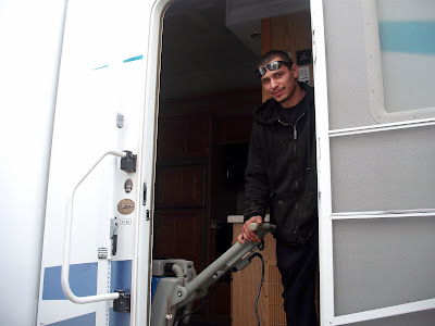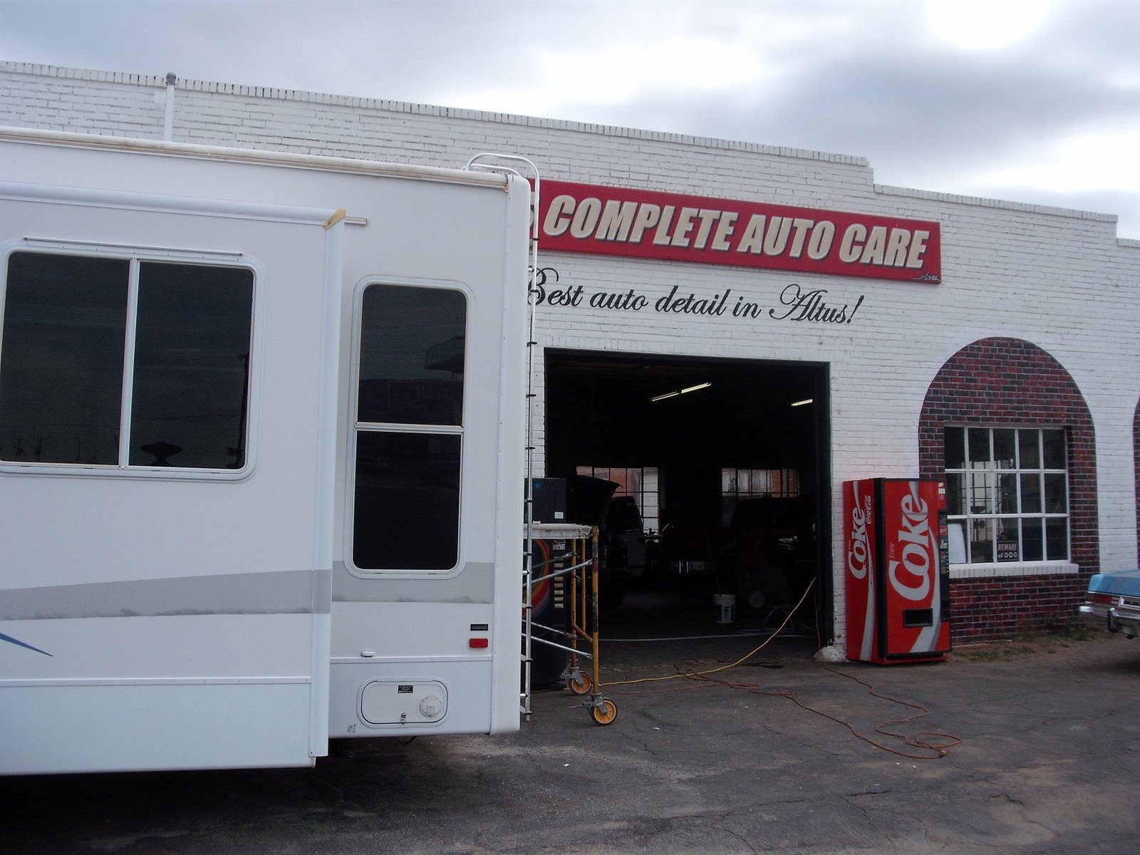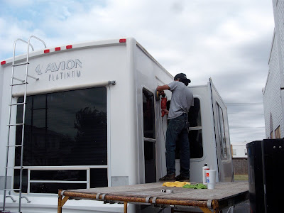Today was a pretty busy day...went to work-checked out which direction the wind was blowing- or was going to be blowing...fortunatly it was blowing over my head on the 'market place' wall. The I came back home and the owner of the detail shop next door asked me if I could take some pictures of him and his crew working on an RV parked outside. Then got a second wind and went to the lumberyard where this fellow named Sherman sells snocones, repairs appliances, lives there, and now is going to start preaching. So I am installing some window sized signs for him next, and almost have the market place done.