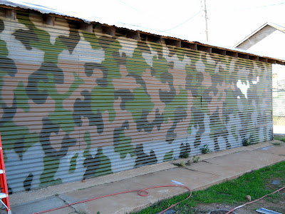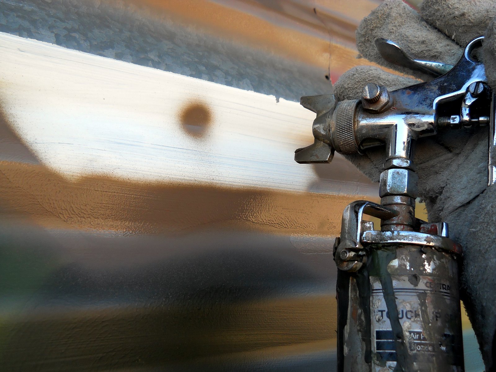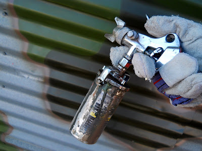 The glove is to keep the wind off of my hand and chilling it to death. But here you can see I have it set on a 'dot' pattern. It will also spray a fan spray with just the turn of a knob...but I prefer this most of the time. Airbrushes spray a dot if you hold it still in one place. This gun does the same thing just bigger.
