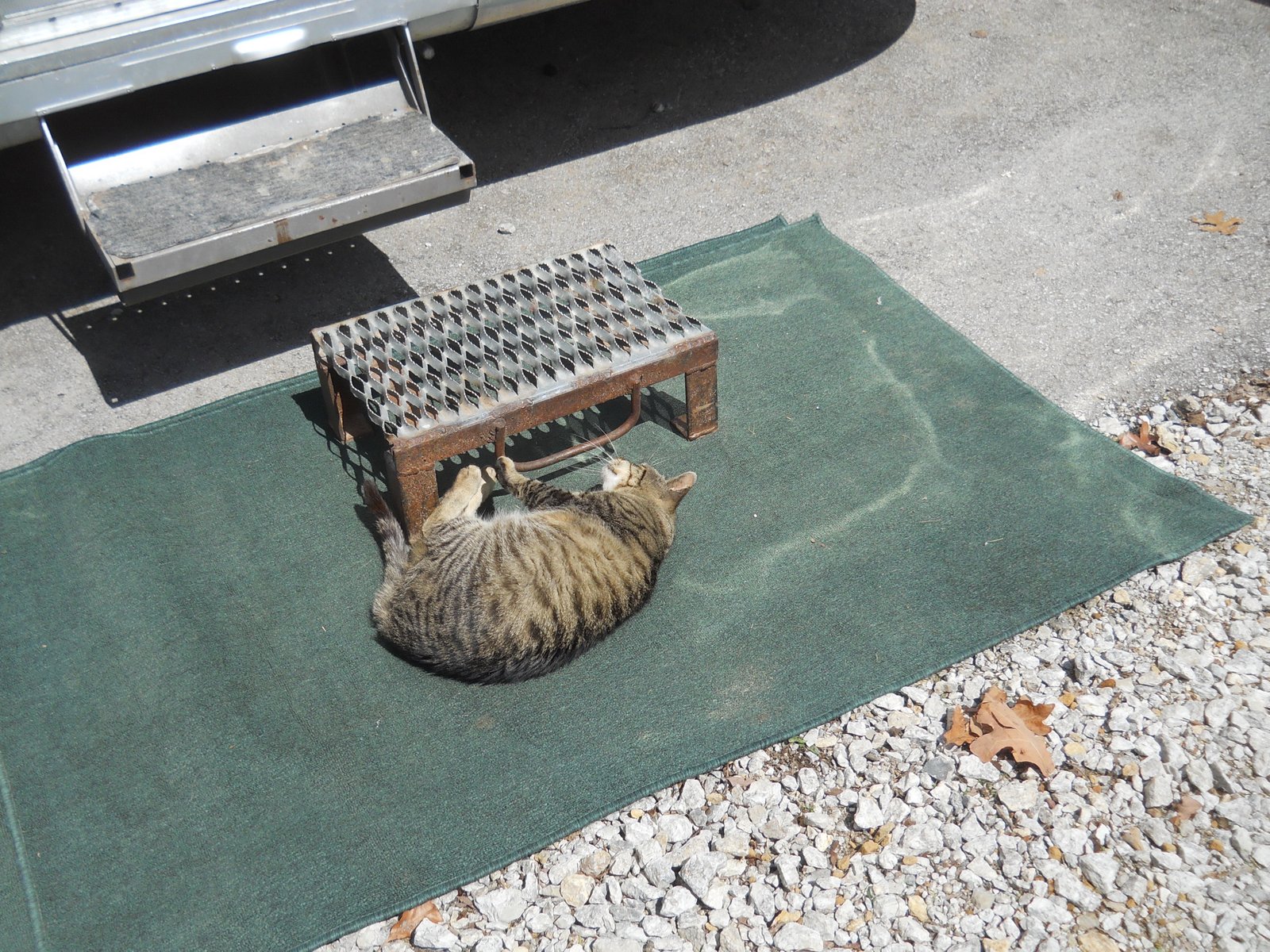 Meanwhile Stewart finds the sun combined with carpet his favorite spot. We have had that -(what I call) the boot scraper he is rolling next to, for many years and it's hand welded and great for weighing things down when needed.