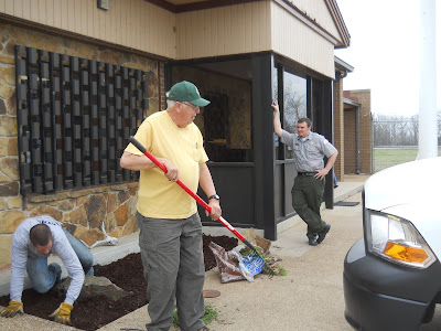 Back at the Corps office, Arnold and team are laying new mulch out on the rear garden.