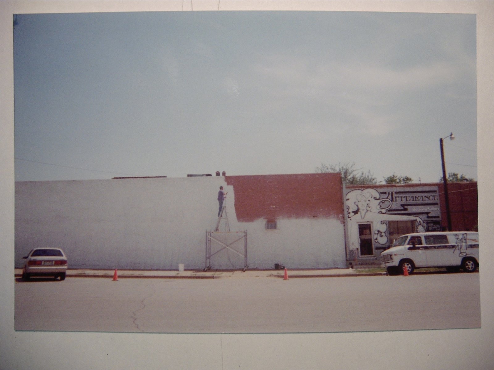Then, I did some out lining of the old windows and door. Then proceeded filling in the new brick look. This time we varigated the brick color to break it up (artist slang)...then took the airbrush and filled in the grey concrete mortar between the bricks.